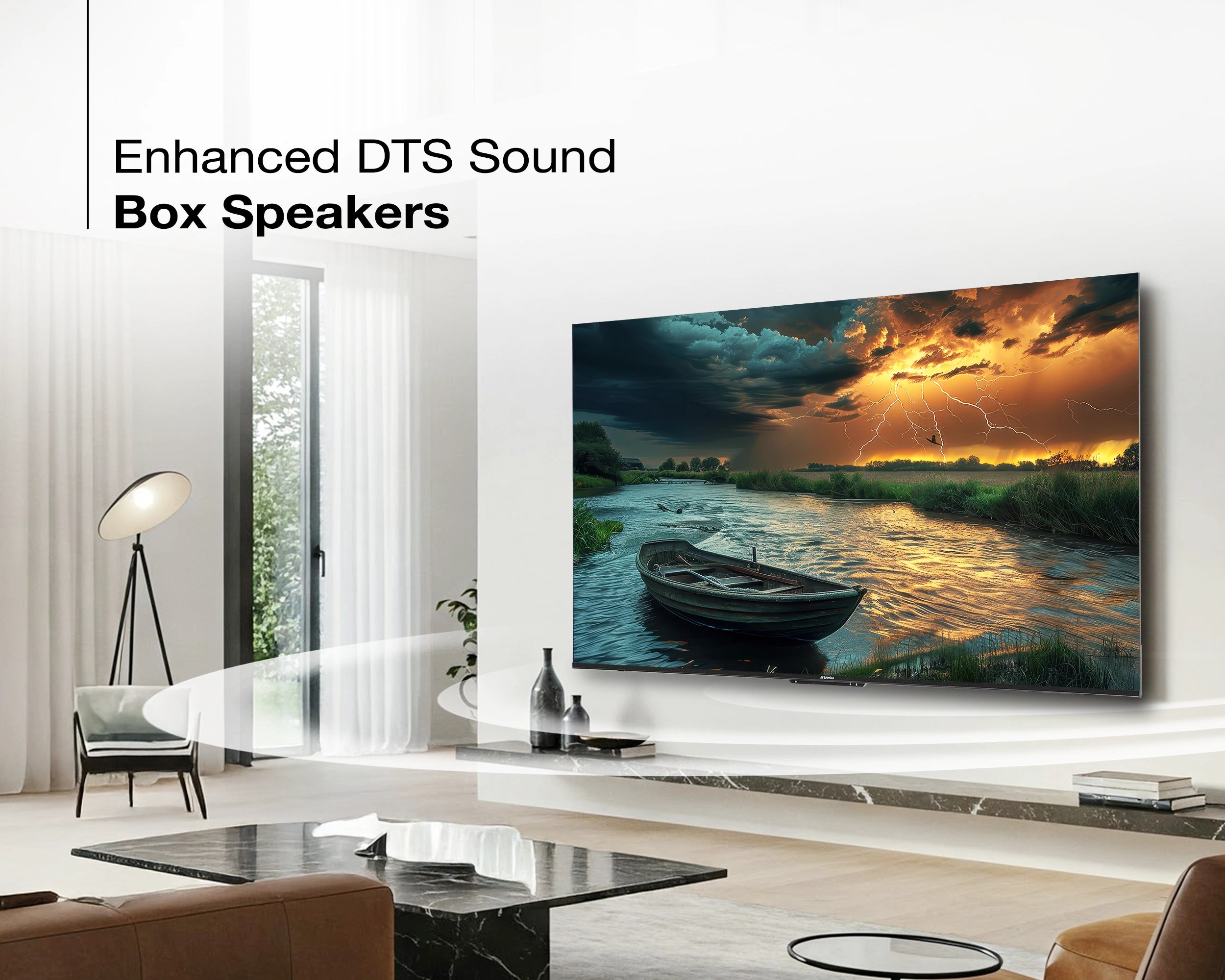 Experience unparalleled audio immersion with Dolby Atmos and DTS sound, enhanced by robust box speakers featuring automatic volume control for superior listening enjoyment.
