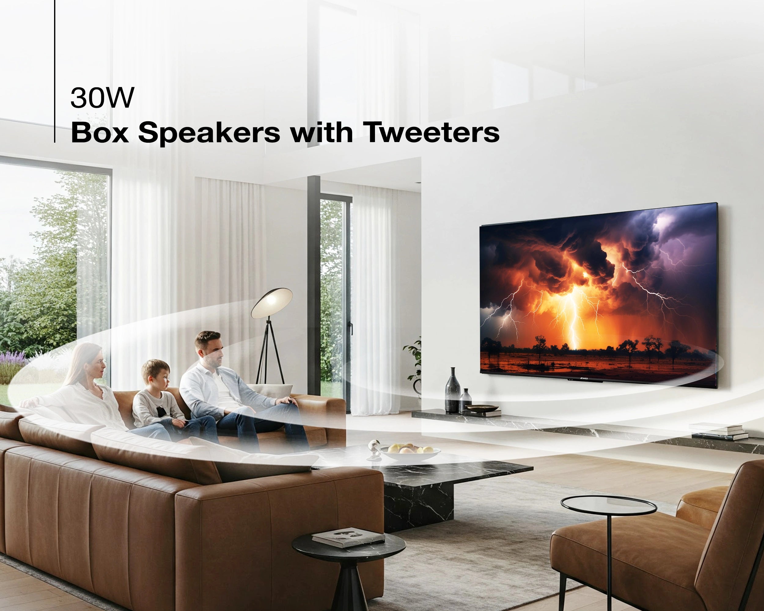 Experience unparalleled audio immersion with Dolby Atmos and DTS sound, enhanced by robust 30W box speakers featuring tweeters and automatic volume control for superior listening enjoyment.
